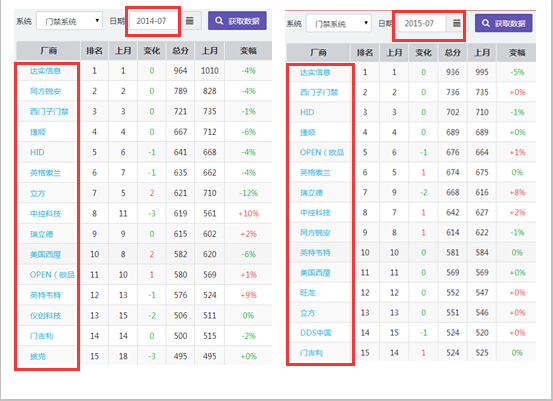 從上圖門禁數據對比顯示中我們不難看出,近一年的門禁系統企業們排名變化之大,其中表現最為明顯的莫屬“同方銳安”了,從2014年行業排名第二,下跌至2015年行業第九;可以看出在感應卡技術,生物識別技術、物聯網等新技術需求給行業帶來的激烈競爭。