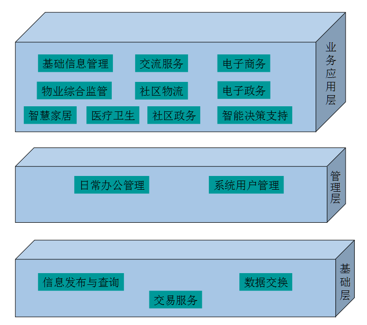 在物聯網應用環境下,可將智慧社區服務系統的功能需求可概括為以下三個層次基礎層、管理層、業務應用層。