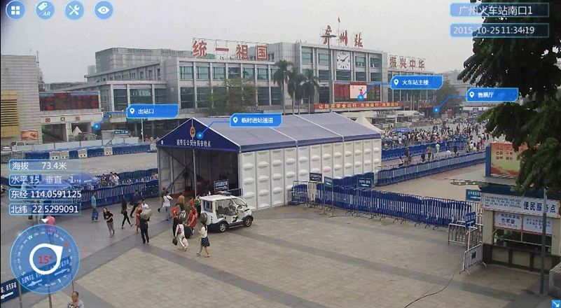 “增強現實”在攝像機領域是一個全新的概念,普通攝像機反映的是“現實”,這種現實由于缺少附加性的信息,給監控畫面的安保人員帶來了極大的困惑。為了解決這些問題,需要在“現實”的基礎上進行“增強”,給實時監控畫面添加名稱、經緯度、方位角、距離、位置、歷史案例描述、聯系方式等等信息,這些輔助能屏幕前的安保人員及時有效地處理視頻畫面捕捉到的異常、突發情況。